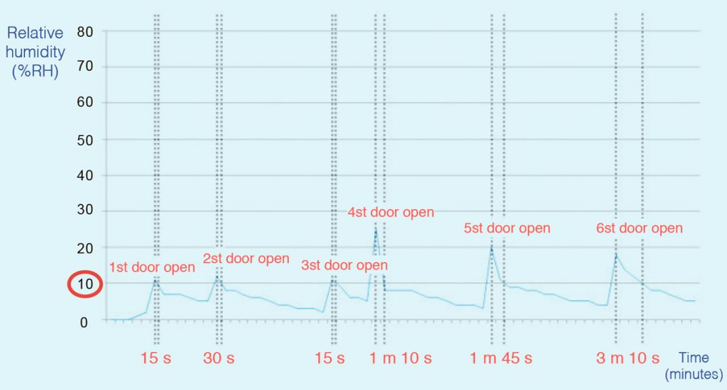After opening the door for 30 second and the humidity can drop back to 10%RH within 5 minutes.