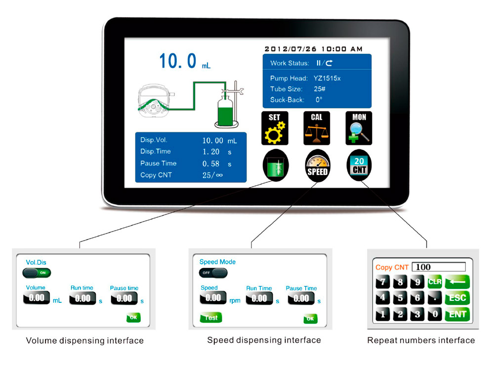 - Can preset dispensing volume, dispensing time, pause time and copy numbers.